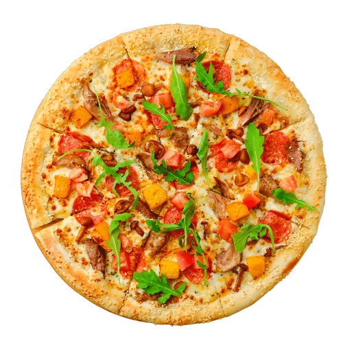 Salsa pomodoro, queso mozzarella, queso de cabra, prosciutto, jitomate deshidratado